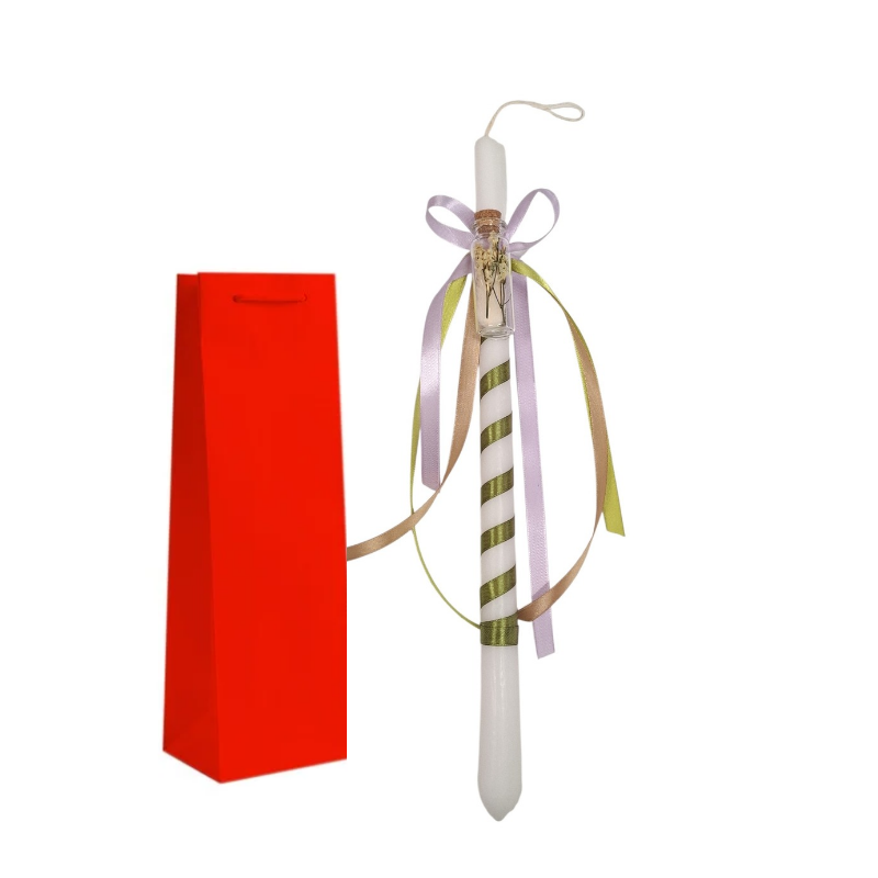 Η λαμπάδα φέρει διακοσμητικό και είναι διακοσμημένη με κορδέλες σε ταιριαστά χρώματα